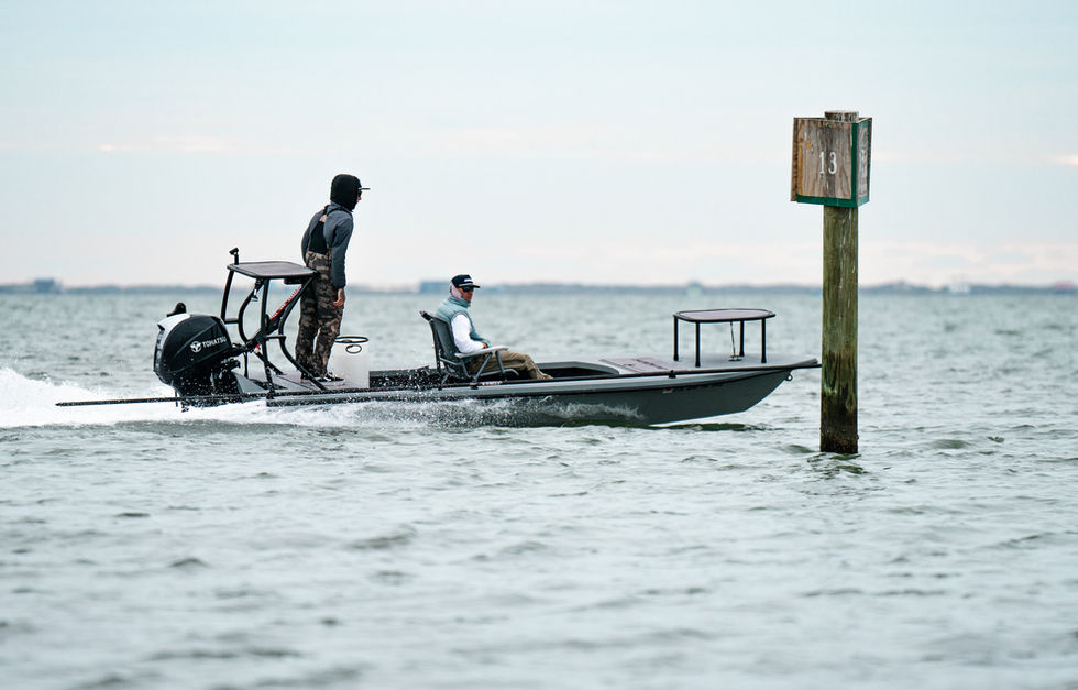 Basic Rigging - front and rear dry storage hatch, 15 gallon built-in fuel tank, under gunnel rod holders facing Aft, 6 rod tubes, black heavy duty rub rail, Odyssey 1200 Cranking Battery, Battery on/off switch, Blue Sea 12 panel fuse bank, 800 Rule bilge pump w/ switch, Pop-up cleat on fore deck, hull painted (1) color customer's choice, Standard poling platform w/ Seadek, Seadek cockpit floor and VMarine push pole holders